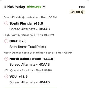 High Point and Wisconsin OVER 67.5 Total Points (1:50 p.m., TBS): This should be a fast-paced game that’s up and down the floor. High Point averaged nearly 90 points this season.
